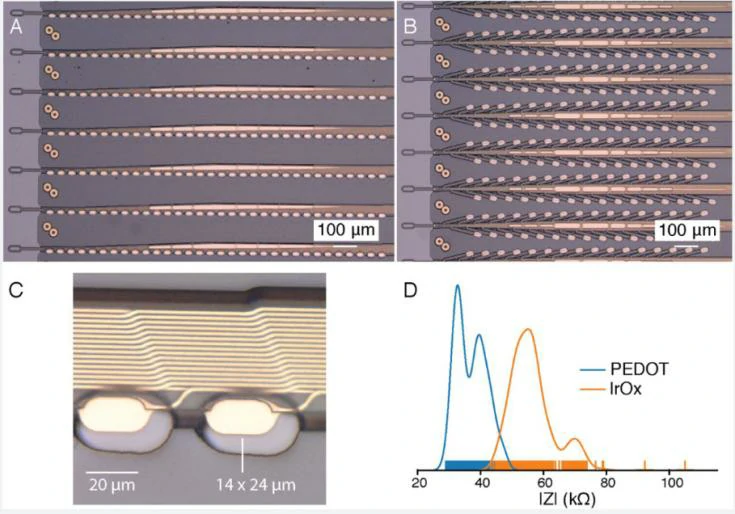 (A) 单独的神经处理应用特定集成电路,能够处理256个数据通道。这个特定的封装设备包含12个这样的芯片,总共有3072个通道。 (B) parylene-c基板上的聚合物线缆。 (C) 钛合金外壳(盖已取下)。 (D) 用于供电和数据传输的数字USB-C连接器。