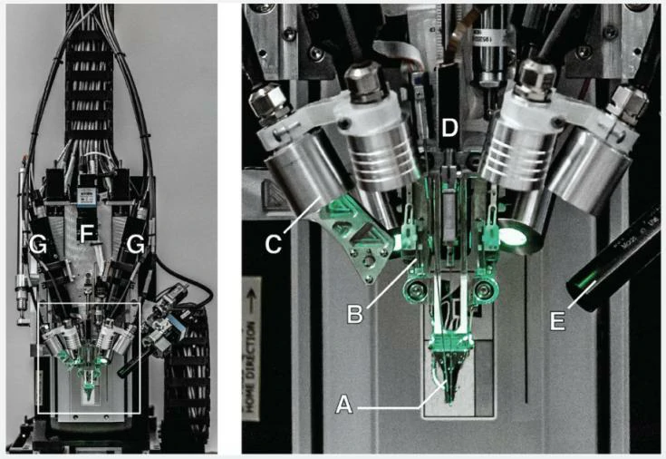 机器人电极插入器:插图中显示了插入器头部的放大视图。 (A) 装载的针夹插卡。 (B) 低压接触式脑位置传感器。 (C) 具有多个独立波长的光模块。 (D) 针头马达。 (E) 四个摄像头之一,用于对插入过程中的针进行聚焦观察。 (F) 具有手术区域广角视图的摄像头。 (G) 立体摄像头。