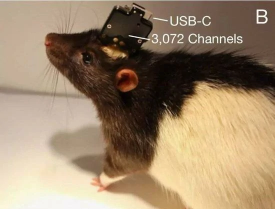 马斯克团队已把这套系统安装到大鼠脑中(见图4),读取3072个电极的信息,这比目前在人脑中埋置的脑机接口至少要高出一个数量级。后来他们又将类似系统应用到猴子上,实现了猴脑控制计算机。