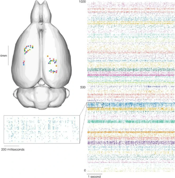 设备允许记录分布在多个脑区和大脑皮层层次上的广泛神经活动。图5左图:线缆插入位置(用彩色圆圈表示)显示在渲染的啮齿动物大脑上。图5右图:同时记录的1020个通道的光栅图,按线缆排序(颜色对应插入位置)。插图:来自单个线缆的尖峰放电的放大光栅图。