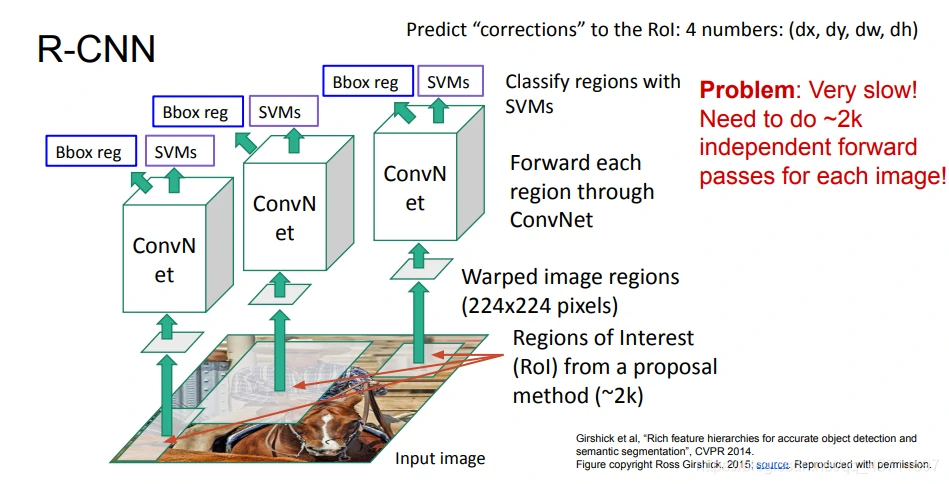 R-CNN:主要思路是使用无监督的选择性搜索方法将输入图像中具有相似的颜色直方图特征的区域进行递归合并,产生大量的候选区域,然后从输入图像中截取这些候选区域对应的图像,将其裁剪缩放至合适的尺寸,并送入一个CNN提取的网络中提取特征,最后再送入一个SVM分类器中进行分类和非极大值抑制操作即可得到最终结果,如下图所示可以概括R-CNN的整个过程: