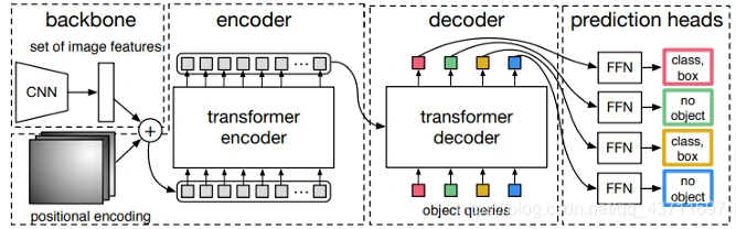 **DEtection TRansformer (DETR)**是Facebook研究团队巧妙地利用了Transformer 架构开发的一个目标检测模型。DETR模型由一个预训练的CNN骨干(如ResNet)组成,它产生一组低维特征集。这些特征被格式化为一个特征集合并添加位置编码,输入一个由Transformer组成的编码器和解码器中,和原始的Transformer论文中描述的Encoder-Decoder的使用方式非常的类似。解码器的输出然后被送入固定数量的预测头,这些预测头由预定义数量的前馈网络组成。每个预测头的输出都包含一个类预测和一个预测框。损失是通过计算二分匹配损失来计算的。如下图所示为其基本的结构: