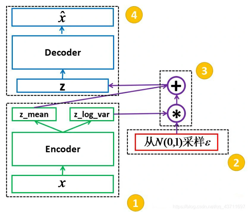 变分自编码器(VAE):VAE就是AE的进化版本,基础结构和AE相差不大,但是在中间隐空间的编码部分并不相同,AE的主要特点是能够模仿或者说和输入的数据尽可能接近缺少创新多样性当然本身AE自编码器就是对输入数据的一个压缩编码所以这也就是AE缺点的原因所在;再说说VAE的主要变化,其主要优势就是在编码器后产生的隐向量的概率分布能够尽量接近某个特定的分布即编码器的直接输出的是所属正态分布的均值和标准差,然后根据均值和方差采样得到隐向量z,这样就可以根据采样的随机性生成具有多样性的生成图像,如下图是VAE的基本框架: