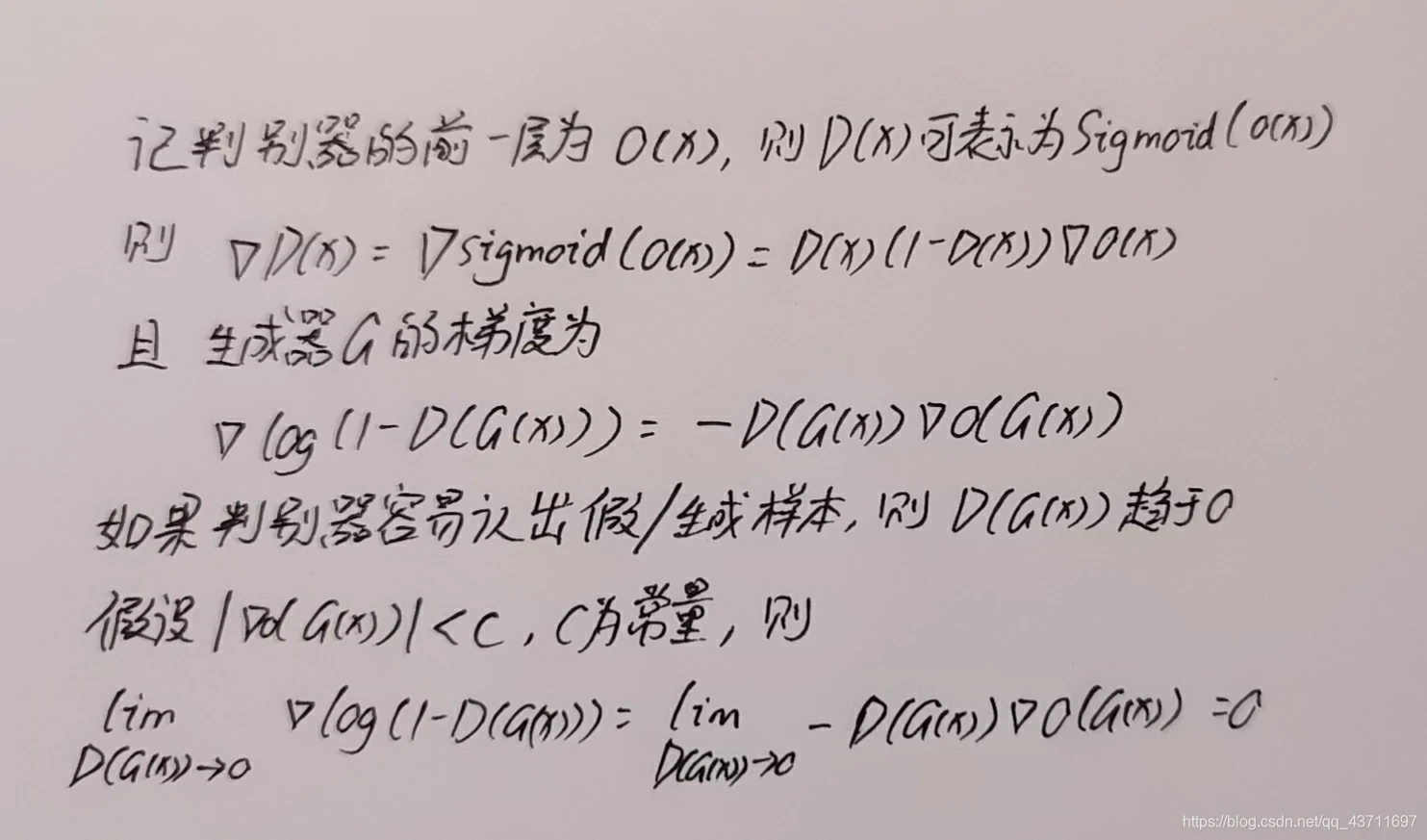 梯度消失:原始GAN的优化目标如上所示,在开始训练的时候生成器一般将会较为灵敏的判断出真假数据,这样造成的结果就是目标损失函数达到饱和,梯度消失,如下图是大概的推断GAN为什么梯度消失的过程: