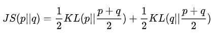 JS散度的定义是基于KL散度上,但是JS散度主要是用来度量两个概率分布的相似度且JS散度是对称的其值分布在0-1之间,并且JS散度用于原始GAN中的损失函数的推导上,如下为JS散度公式: