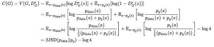 顺便附上GAN和JS散度之间的关系,其中该目标是使得D的目标函数值最大化(摘自GAN原作者的证明)