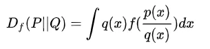 f-散度:f-散度可以理解为KL散度的一般化形式(当对应的f取值为xlogx时即为KL散度),如下公式所示: