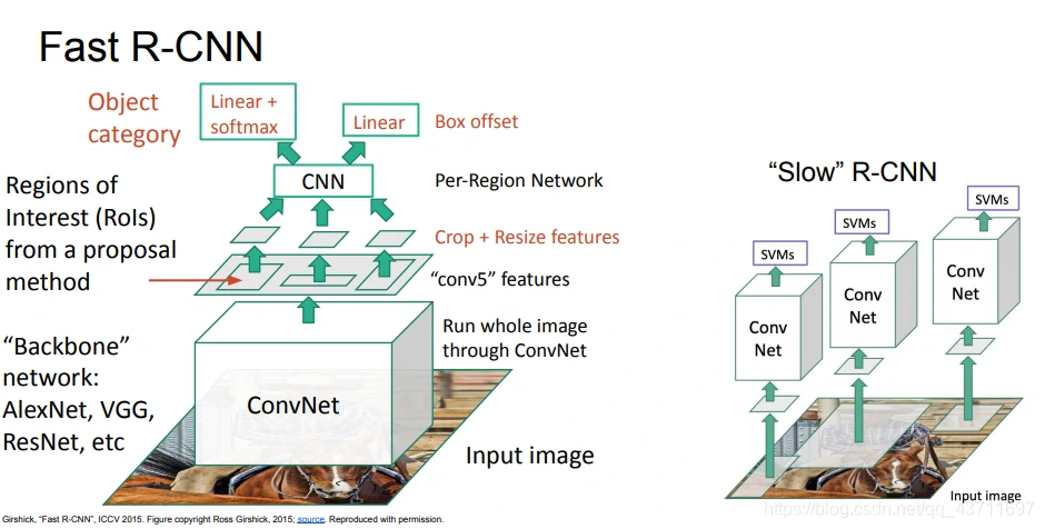 Fast R-CNN:Fast R-CNN通过卷积网络得到图像的高分辨率特征映射,切分图像的像素,基于备选区域投影到卷积特征映射,从中提取属于备选区域的卷积块。然后用兴趣区域池化层(ROI pooling layer)来使卷积块变为固定尺寸,输入全连接层进行分类。同样有一个多任务损失,需要基于全局反向传播同时学习。它可以重复运用卷积计算,因此时间主要消耗在寻找备选区域。