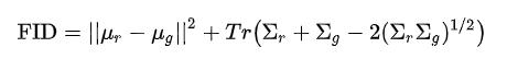 FID评价指标:FID评价指的是在InceptionV3的倒数第二层上进行一个真实样本和生产样本的特征图的均值和方差来比较,公式如下: