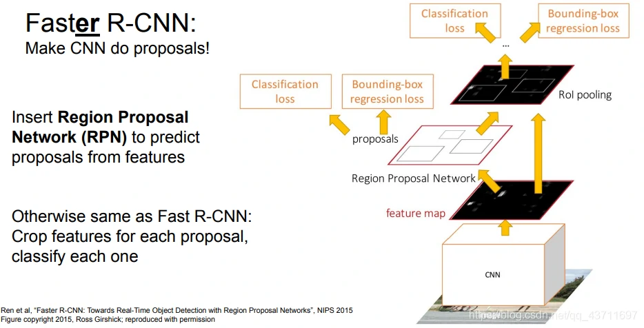 Faster R-CNN:让卷积网络去预测备选区域,其余与Fast R-CNN相同。神经网络同时处理四件事:备选区域是否是待识别物体,校正包围盒,最终物体识别的损失,最终包围盒补偿的损失