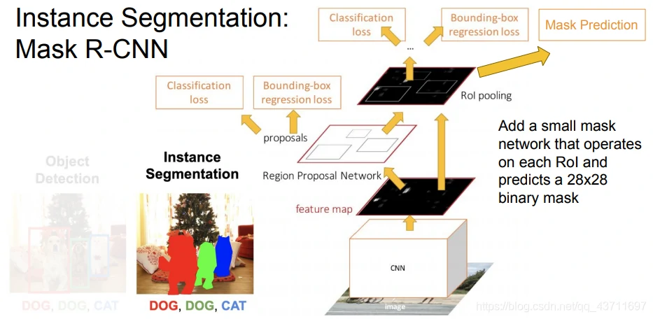 Mask R-CNN:Mask R-CNN将整张输入图像送入卷积网络和训练好的候选框生成网络,然后将候选框投射到卷积特征图上,然后产生两个分支,一个预测出分类类别分数和边界框的坐标,另一个是一个语义分割的微型网络。