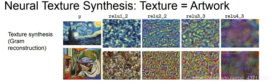 风格迁移:提取输入图像通过神经网络运行到某一层,接着进行反向传播并且设置该层的梯度等于激活值,然后反向传播到图像并不断更新图像;人工纹理合成算法是将特征转换为Gram矩阵,然后使得两张图像Gram矩阵最相似,在实际应用的过程中,往往会将多层网络的Gram矩阵相似性都考虑进最终结果。