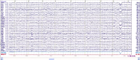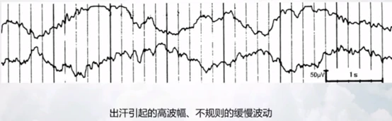 出汗引起的伪迹如下图,高波幅、不规则的缓慢波动。