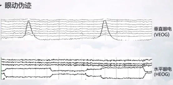 如下图,垂直眼电为尖头的脉冲,水平眼电为水平的方波。
