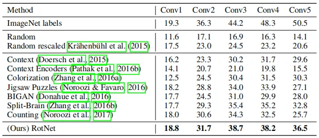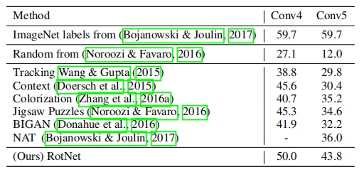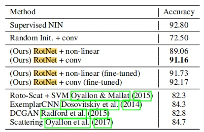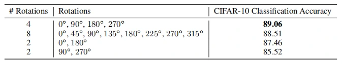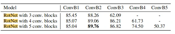 同时,为了使得RotNet模型更佳,文中研究了与离散旋转的数量关系。作者额外设计了一组含有8个旋转角度(0, 45, 90, 135, 180, 225, 270, 315)和2组含有2个旋转角度(0,180)、(90,270)的情况进行对比。结果如表2所示,并不是越多角度越好(过多角度可能产生视觉误差),之前的4个角度方案更佳适合。