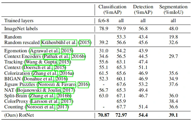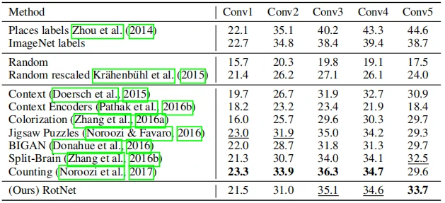 基于上面的结论,在和其他无监督方法对比时,作者用到的是在RotNet模型中第二个卷积模块产生的特征图像,然后设计了两种分类器:由三个全连接层组成的非线性分类器和由三个卷积层+线性预测层(相当于一个卷积模块)组成的分类器,即最后分别是RotNet + non-linear和RotNet +conv的方法。结果如表3所示。相较其他无监督方法,该论文提出的方法(尤其RotNet +conv)更为出色,并且也只是略低于有监督情况下的准确度,并且显示微调对准确度的提升是有帮助的。