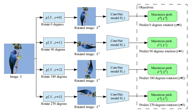 这几个离散的旋转角度就是该方法中自己创建的伪标签(这里分别设为y=0,1,2,3),然后把这些不同旋转角度的图片放入到ConvNet网络,让其不断训练学习,计算出四种旋转变换的概率,选最大概率作为预测结果(即四分类任务),具体步骤如图2所示,其中g(.)为旋转变换函数,F(.)为对图片旋转变换识别得到的概率,如Unsupported image type.代表旋转90度的概率。