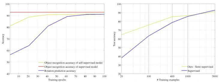 受自监督取得较好结果启发,作者也将该思想和RotNet用作半监督下的研究,在训练分类器时使用的只是可用图片的一组子集及其对应标签,并将该方法与一种用所有可用图片训练分类器的全监督方法进行对比,结果如图4所示。实验结果表明,在可用图片样例较少时,半监督的方法优于全监督的方法。