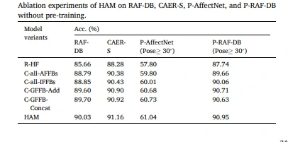 表4的作用在于验证和比较了HAM模块及其变体在不同数据集上的性能,进一步证明了HAM在特征融合和注意力机制方面的优势。结果显示,HAM通过综合考虑特征的多样性和尺寸,在面部表情识别任务中取得了显著的性能提升。而GFFB的引入也使得模型能更精准地关注与表情相关的信息,增强了识别的准确性。