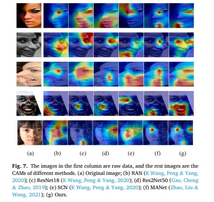 图6展示了不同模型在面部表情识别任务中的类激活图(CAM),用于对比这些模型在图像中关注的区域。每一行的第一张图是原始图像,接下来的是不同模型的类激活图,包括了本文提出的模型和其他一些现有模型,如 RAN、ResNet18、ResNet50、SCN、FG-AGRL 和 MANet。通过这些类激活图,可以看出不同模型在面部表情识别过程中关注的面部区域和特征。