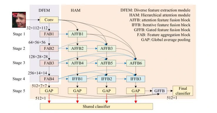 大多数面部表情识别方法仅使用一个分类器来处理特征向量不同,本文使用共享分类器和最终分类器。共享分类器:用于提取和学习所有特征向量中的通用特征,鼓励模型学习更具泛化性的特征表示。最终分类器:将浅层和深层特征融合,帮助模型区分不同的面部表情,提高对面部表情的理解。
