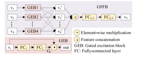 GFFB细节图如图5所示。GFFB用于测量每个高层特征向量的有用性,并据此聚合信。GFFB包含多个门控单元(GEB1、GEB2、GEB3、GEB4),每个门控单元对应一个特征向量。这些门控单元通过计算每个特征向量的重要性来决定它们在最终融合特征中的贡献,并有效抑制无用的信息。GFFB能够有效地选择和融合对识别任务最有用的特征。
