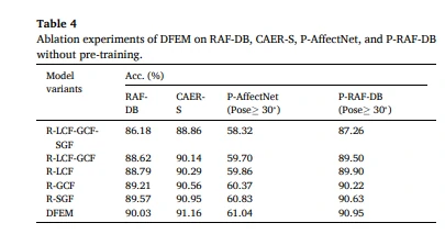 表3的主要目的是展示DFEM在不同数据集上相对于其他模型变体的性能优势,强调了局部上下文特征的重要性以及融合不同特征对面部表情识别性能的积极影响。