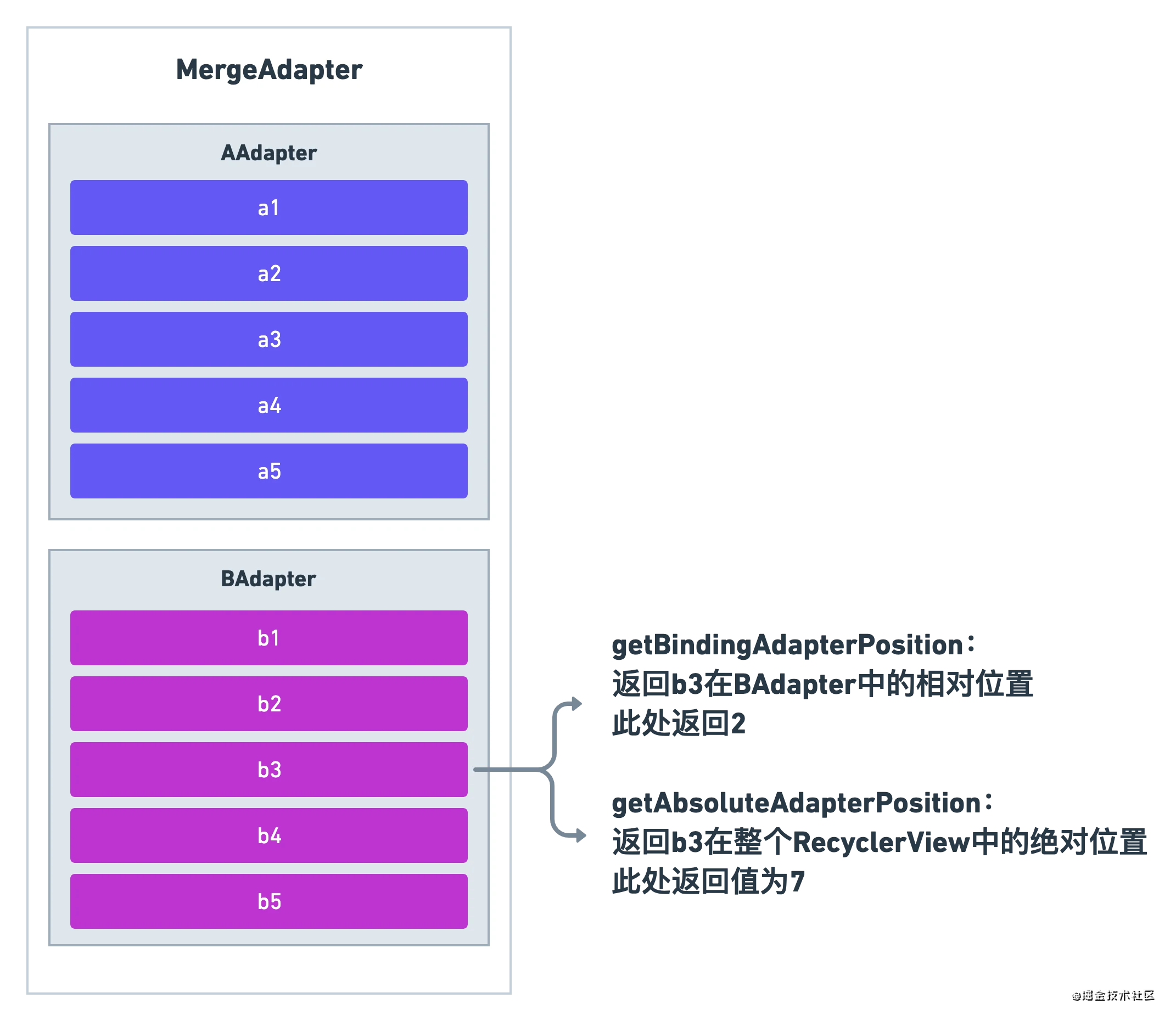 getBindingAdapterPosition将会返回该ViewHolder相对于它绑定的Adapter中的位置,即相对位置。