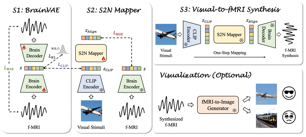 在此基础上,SynBrain 将任务拆解为两步:先通过 BrainVAE 学习 fMRI 响应的语义约束概率潜空间,再通过 S2N Mapper 搭建视觉语义与该潜空间的桥梁,最终实现一步式、高保真的 fMRI 合成。
