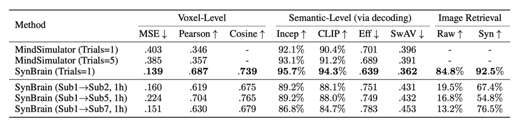 SynBrain 在大规模公开数据集 Natural Scenes Dataset(NSD)上完成全面评估,从体素级保真度、语义一致性、跨被试适配能力、数据增强能力等多维度验证性能优势。