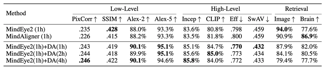3)合成数据提升下游解码性能:SynBrain生成的 fMRI 信号用于数据增强,可显著改善少样本场景下的 fMRI-to-Image 解码效果。在仅含 1 小时真实数据的训练中,加入1 小时合成数据后,MindEye2 模型的语义层次指标全面提升,验证了合成信号的真实和实用价值。