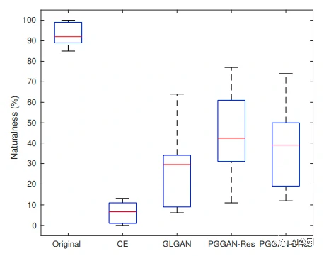 作者对这些方法进行了感知评估,如图7所示。12名投票者被要求对原始图像的自然程度和各种方法的修复结果进行评分。每个选民从巴黎街景数据集中随机分配了500张图像。注意CE是在128×128图像上训练的,因此它在256×256测试图像上的性能很差。其他方法在这种感知评价上也有类似的表现。