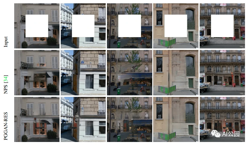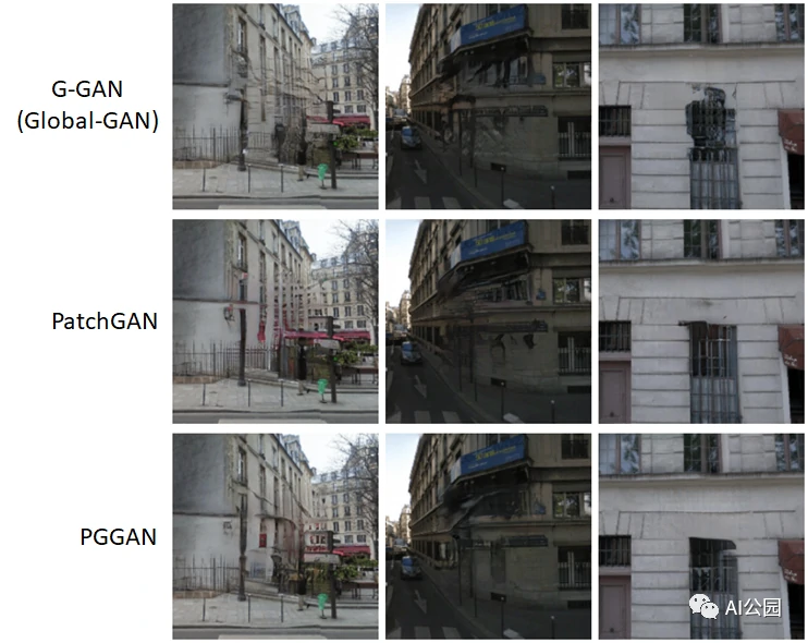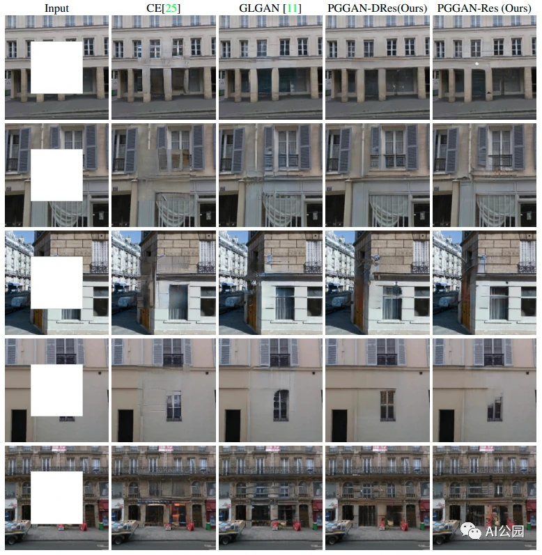 图6显示了用不同判别器训练同一生成器网络的修复结果。从图6的最后一列来看,如果只使用G-GAN鉴别器,则会观察到窗口的局部纹理细节很差。与G-GAN相比,PatchGAN提供了更好的窗口局部纹理细节,但窗口的角落看起来与全局结构不一致。总之,PGGAN可以提供最好的视觉效果。
