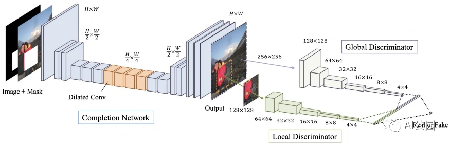 Globally and Locally Consistent Image Completion (GLCIC)是深度图像修复任务中的一个里程碑。作者采用完全卷积网络(FCN)与扩张卷积(DilatedConv)作为他们提出的模型的框架。FCN允许不同的输入大小和带膨胀的conv来替换通道全连接层,用于理解整个图像上下文。在此基础上,采用两种鉴别器对两种尺度下的完整图像和真实图像进行区分。一个全局判别器着眼于整个图像,而一个局部判别器着眼于局部填充后的图像patch。文章链接:图像修复中的一个里程碑:全局和局部一致性的图像补全