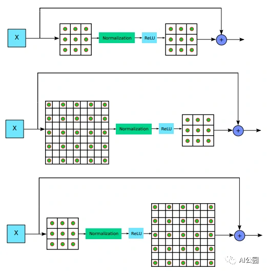 图4,残差块类型,从上到下依次为:标准残差块、扩张卷积在前的残差块、扩张卷积在后的剩余块