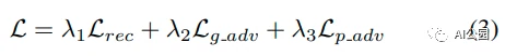 式3为其联合损失函数。Lambda 1, 2, 3用来平衡每个损失的重要性。g_adv表示全局分支给出的输出,而p_adv表示PatchGAN分支给出的输出。需要注意的是,在他们的实验中,λ 1,2,3分别设置为0.995,0.0025和0.0025。