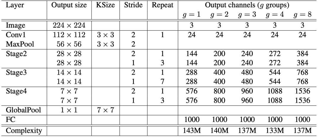 基于上面改进的 ShuffleNet 基本单元,设计的 ShuffleNet 架构如表 1 所示。除了开始使用的普通的 3x3 的卷积和 max pool 层,网络主要由 ShuffleNet 单元堆叠组成,包括三个阶段。每个阶段的第一个构建块都是 stride=2,这样特征图 width 和 height各降低一半,而通道数增加一倍,其它超参不变。对于下一个阶段,输出通道加倍,与ResNet 相似,将每个 ShuffleNet 单元的瓶颈通道数设置为输出通道的 1/4。