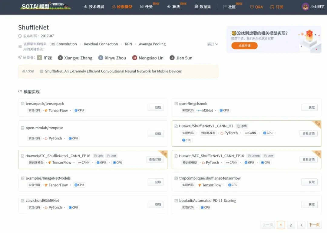 当前 SOTA!平台收录 ShuffleNet 共 26 个模型实现资源,支持的主流框架包含 TensorFlow、PyTorch、CANN、MXNet 等。