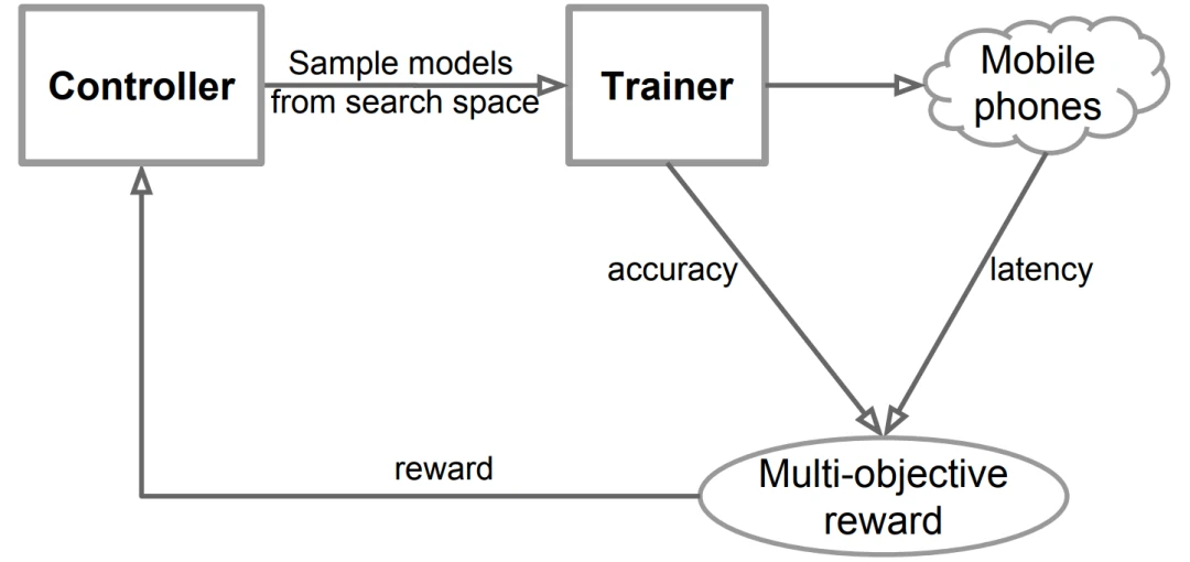 搜索框架由三部分组成:循环神经网络控制器,一个训练器获得模型精度和移动推理引擎获得模型推理延迟。在每一步中,控制器使用它现在的参数采样一组模型,基于 RNN的 softmax logits 预测一组 tokens。对于每个采样模型 m,在目标任务上训练,计算精度 ACC(m),在平台上运行模型获得推理延迟 LAT(m),根据目标函数计算奖励值 R(m)。在每一步的最后,最大化期望奖励来更新控制器参数。一直循环到达到最大的步数或参数收敛。