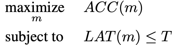 给定一个模型 m,ACC(m)表示它在目标任务上的准确性,LAT(m) 表示在目标移动平台上的推理延迟,T 是目标延迟。一个常见的方法是将 T 作为一个硬约束,并在这个约束下使精度最大化: