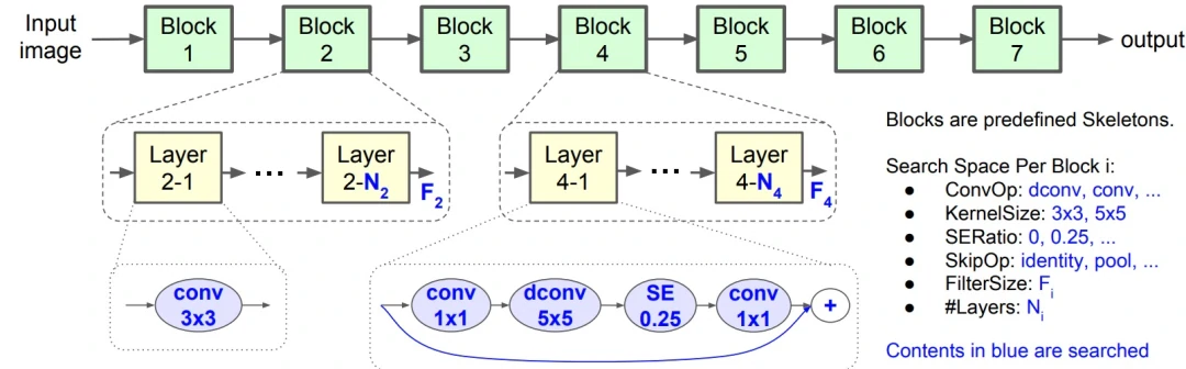 如图 27 所示,将 CNN 模型划分为一系列预定义的 Block 序列,逐渐降低输入分辨率和增加滤波器尺寸。每一个 Block 内含有一系列 identical layers,其卷积操作和连接由每一个 Block 搜索空间确定。搜索空间包括: