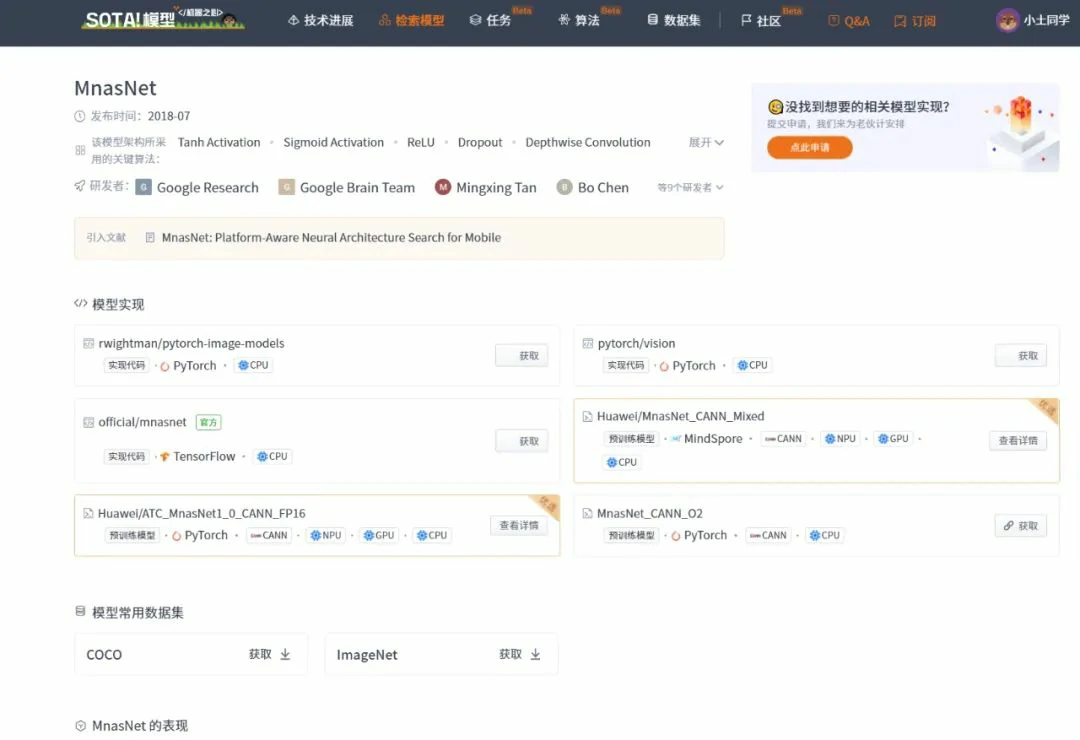 当前 SOTA!平台收录 MnasNet 共 6 个模型实现资源,支持的主流框架包含 PyTorch、CANN、MindSpore、TensorFlow 等。