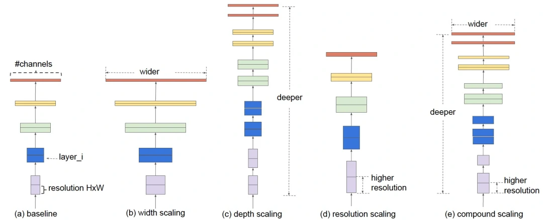 作者提出了一种新的复合缩放方法,该方法使用一个统一的复合系数 ϕ 对网络的宽度,深度和分辨率进行均匀缩放。