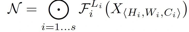 作者在论文中对整个网络的运算过程和复合扩展方法进行了抽象。首先定义了每一层卷积网络为 F_i( X_i),X_i 是输入张量,Y_i 是输出张量,而 tensor 的形状是< H i , W i , C i >。整个卷积网络由 k 个卷积层组成,整个卷积网络为: