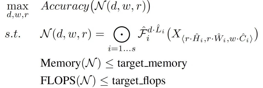 为了探究 d , r , w 这三个因子对最终准确率的影响,将它们加入到公式中,可以得到抽象化后的优化问题(在指定资源限制下):