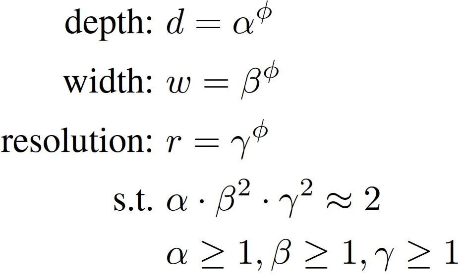 其中 α , β , γ 是通过一个小网格搜索的方法决定的常量。通常来说,ϕ 是一个用户指定的系数来控制有多少的额外资源能够用于模型的缩放,α , β , γ 指明了怎么支配这些额外的资源分别到网络的宽度、深度和分辨率上。尤其是,一个标准卷积操作的运算量的比例是 d , w^2 , r^2 双倍的网络深度将带来双倍的运算量,但是双倍的网络宽度或分辨率将会增加运算为 4 倍。