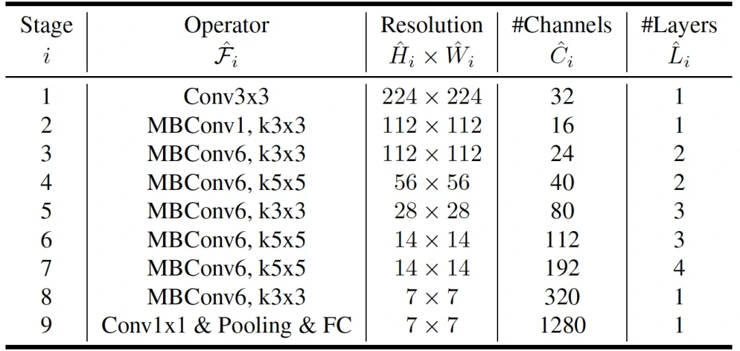 以上决定了一个 block 的结构,其中,ConvOp、Kernel Size、SE ratio、SkipOp 和 Fi 决定了一个 layer 的结构,Ni 决定了 layer 重复的数量。图 5 中,block 4 的每个layer 有一个倒置的瓶颈 5x5 卷积层、恒等残差,这样的 layer 重复了 N4 次。