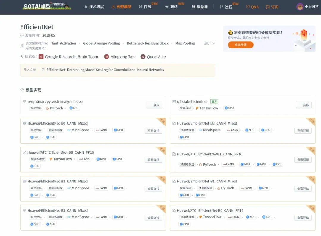 当前 SOTA!平台收录 EfficientNet 共 14 个模型实现资源,支持的主流框架包含 CANN、PyTorch、TensorFlow、MindSpore 等。
