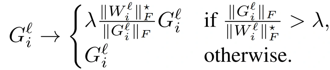 其中,W^l 是 的第 L 层的权重矩阵, G^l 代表 W^l 的梯度。AGC 关键在于:通过观察梯度 G 的范数与层权重 W 的范数之比,以判断单个梯度下降在多大程度上改变原始权重 W 。根据梯度归一与参数归一的单位长度比值来剪辑梯度,作者发现这比采取层间归一比值的经验表现更好。具体来说,在 AGC 算法中,第 l 层 (G_i)^l(定义为矩阵G^l 的第 i 行)的梯度的每个单元 i 被剪切为: