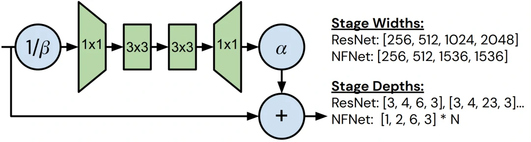 在本文的残差块中没有使用激活归一化层。相反,作者采用了 Normalizer-Free variance downscaling 策略。这意味着残差块的主路径的输入乘以 1/β,其中 β 是初始化时该块方差的分析预测值,块输出乘以一个超参 α。此外,作者还引入 SkipInit,这是一个可学习的零初始化标量增益,除了 α 之外,它将残差块初始化为 identity(除了在过渡层),作者发现这可以提高非常深的网络的稳定性。所有的卷积运算都采用 Scaled Weight Standardization,对标准化的权重采用可学习的 affine gain,对卷积运算的输出采用可学习的 affine bias。